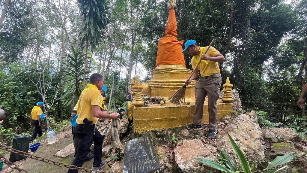 วันที่ 18 ต.ค.2567 เวลา 10.30 น. พ.ต.อ.อุเทน แก้วจันทอน ผกก.สภ.สะท้อน พ.ต.ท.บุญยฤทธิ์ รักษ์เพชร สว.อก.สภ.สะท้อน พร้อมด้วย ข้าราชการตำรวจจิตอาสา สภ.สะท้อน ร่วมทำกิจกรรมจิตอาสา ปลูกต้นไม้ ทำความสะอาด ปรับปรุงภูมิทัศน์ รอบบริเวณพระเจดีย์มงคลโพธิสัตโต หลวงพ่อทวดเหยียบน้ำทะเลจืด ม.3 บ้านประกอบออก ต.ประกอบ อ.นาทวี จว.สงขลา